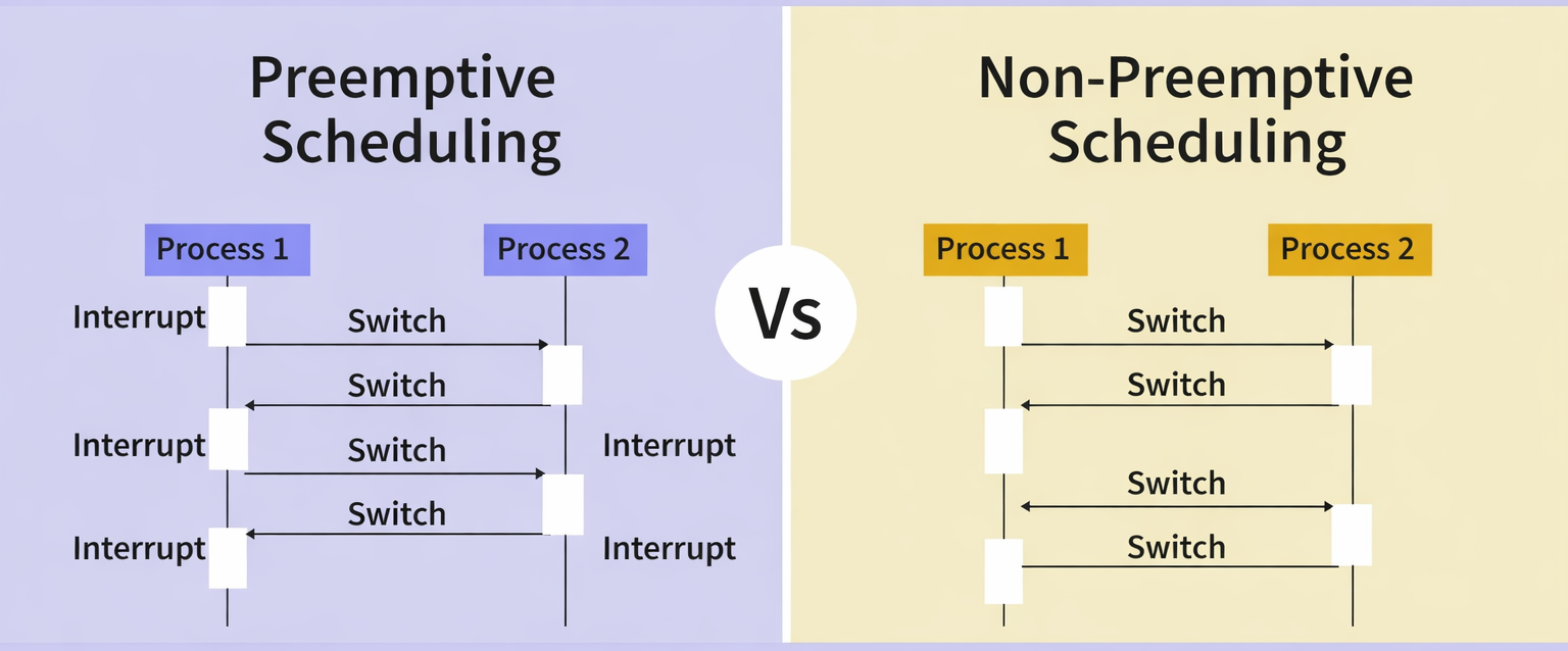 Unlike preemptive scheduling, non-preemptive scheduling does not interrupt a process in the middle of execution. Instead, it waits for the process to complete its CPU burst time before allocating the CPU to another process. This eliminates the overhead of context switching mid-burst, but it also means that a high-priority process arriving while a long process is running must wait — making the system less responsive.