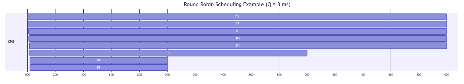 Each process runs for at most 3 ms before being preempted and moved to the back of the queue.
